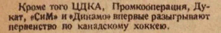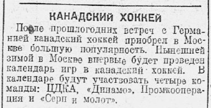 «Стадион завода «Серп и молот». 2 часа дня. Канадский хоккей Берлин - Москва, 4 часа дня - хоккейная встреча Москва - Ленинград. Хоккейный матч Ленинград - Москва судит В. Рябоконь. Судья встречи по канадскому хоккею - М. Козлов»