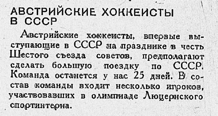 Той же зимой (тогда же раздался призыв «Канадца») в СССР должны были приехать австрийские хоккеисты. По крайней мере такую информацию на своих страницах разместила ленинградская физкультурная газета «Спартак» (№ 14-15 за 15 марта 1931 года): «Австрийские хоккеисты в СССР. Австрийские хоккеисты, впервые выступающие в СССР на празднике в честь VI съезда советов, предполагают сделать большую поездку по СССР. Команда останется у нас 25 дней. В состав команды входит несколько игроков, участвовавших в Олимпиаде Люцернского спортинтерна». А до нее в Москве должно было состоятся два матча: 14 марта со сборной Москвы на Центральном стадионе металлистов и 15 марта со сборной РСФСР на стадионе «Динамо». Но... Видимо, ЛСИ не дал добро на поездку социал-демократических рабочих-хоккеистов в Советскую Россию.