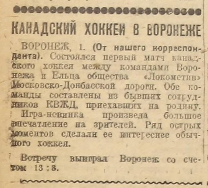1 марта 1935 года. Воронеж. Канадский хоккей. «Локомотив» (Воронеж) - «Локомотив» (Елец) - 13:8 (газета «Красный спорт» № 32 за 3 марта 1936 года)