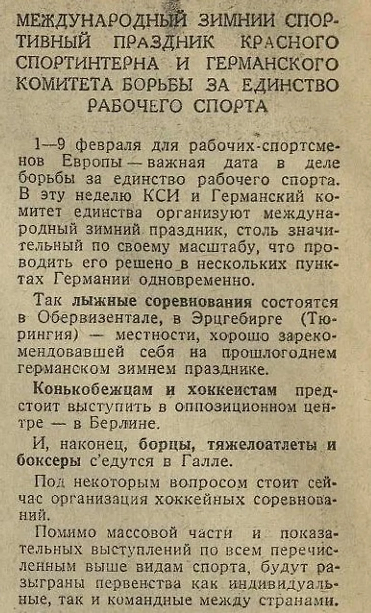 ** - «1-9 февраля для рабочих-спортсменов Европы - важная дата в деле борьбы за единство рабочего спорта. В эту неделю КСИ и Германский комитет единства организуют международный зимний праздник, столь значительный по своему масштабу, что проводить его решено в нескольких пунктах Германии одновременно. Так лыжные соревнования состоятся в Обервизентале, в Эрцгебирге (Тюрингия) - местности, хорошо зарекомендовавшей себя на прошлогоднем германском зимнем празднике, Конькобежцам и хоккеистам предстоит выступить в оппозиционном центре - в Берлине. И, наконец, борцы, тяжелоатлеты и боксеры съедутся в Галле. Под некоторым вопросом стоит сейчас организация хоккейных соревнований. <...> Хоккей. Одна команда от страны» (журнал «Физкультура и спорт» № 2 за 10 января 1930 года)
