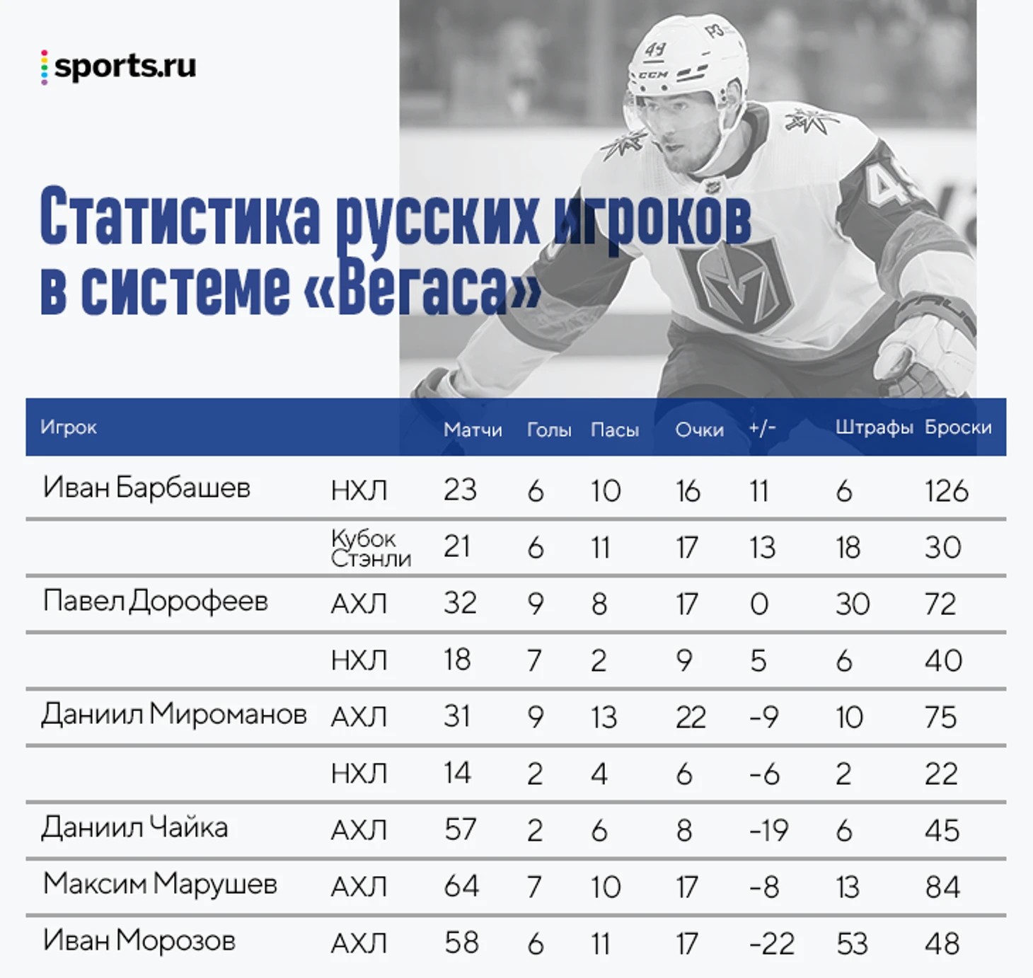 Но не только Барбашев и Шипачев делают «Вегас» ближе к России – в системе собралась перспективная русская банда. В этом сезоне за «Хендерсон» – фарм-клуб «рыцарей» – сыграли сразу пятеро наших: Иван Морозов, Павел Дорофеев, Максим Марушев, Даниил Чайка и Даниил Мироманов.
