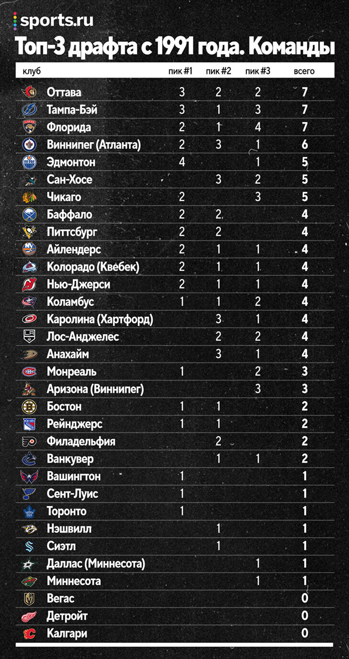 Чаще всех в первой тройке выбирали новички и аутсайдеры 90-х – у них четыре первых места. Воспользоваться этим, чтобы добиться успеха в плей-офф, смогла только «Тампа», победившая в 2004-м, но из четырех выборов в топ-3 драфтов 90-х в чемпионской команде играл только Лекавалье. А вот два высоких выбора уже из нулевых здорово помогли чемпионскому дублю 20-21 – Хедман и Стэмкос.