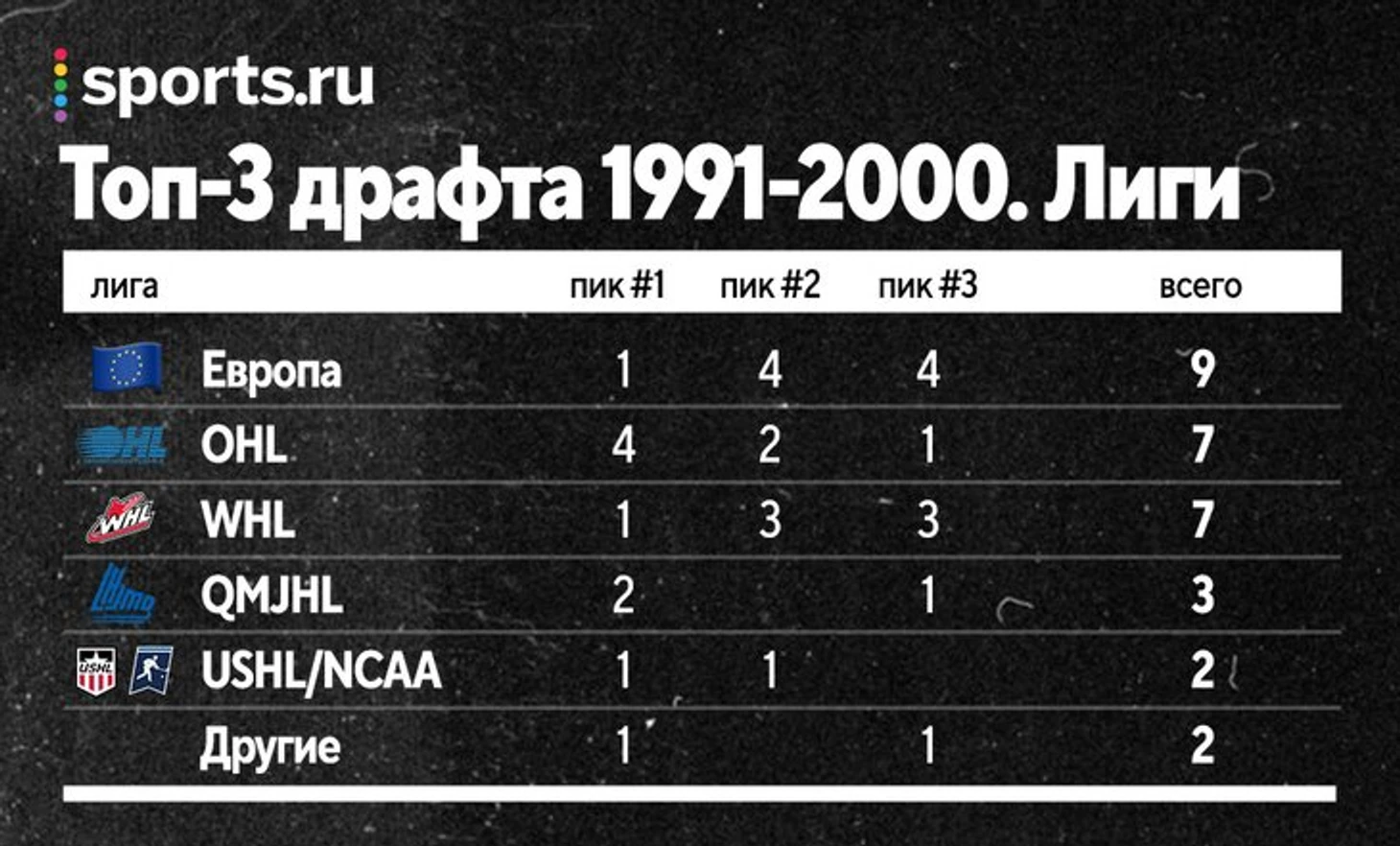 В 90-х в Канаде не было серьезного расслоения между юниорскими лигами, хотя наметилось некоторое отставание Квебека. А европейцы еще массово не уезжали за океан до драфта. Отсюда и суммарное лидерство Европы. Но, обратите внимание, по первым номерам все равно доминируют канадские лиги. При более-менее равных исходных выбор делался в пользу тех, кто уже играл здесь (что логично) – Джовановски/Твердовский, Филлипс/Зюзин, в каком-то смысле даже Штефан/Седины (чех полтора года до драфта провел в ИХЛ), хотя там особые обстоятельства.