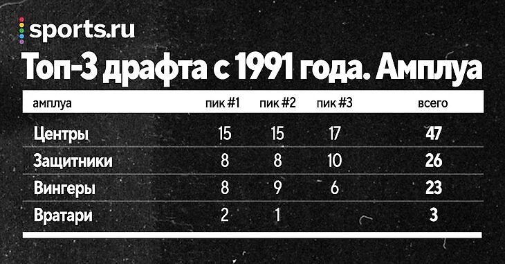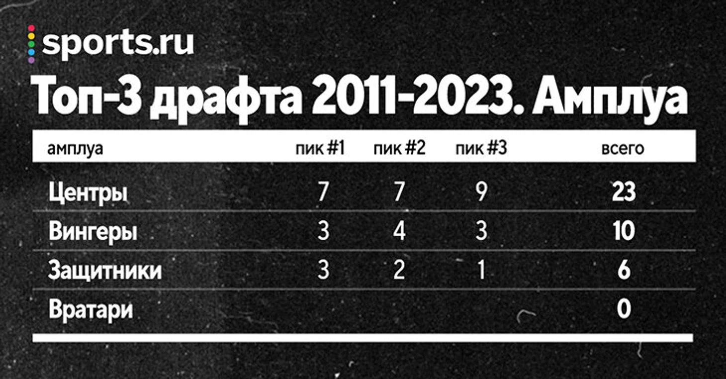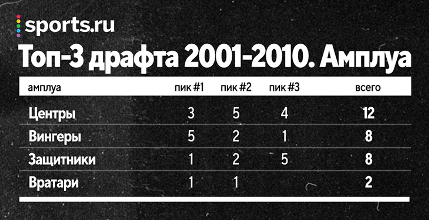 На каком-то отрезке может быть мода на защитников или выстреливать яркие вингеры, но по дистанции центральные вне конкуренции. И это, наверное, логично. Даже если это и не самая важная позиция в хоккее, то, как минимум, самая предсказуемая, с понятным набором навыков, которые понятно как переносить на взрослый уровень. Вратари вообще, как правило, коты в мешке, поэтому слишком высоко их выбирать мало кто рискует, даже когда это очевидные таланты вроде Василевского или Прайса.