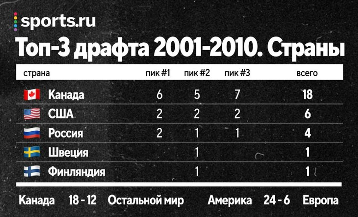 В нулевых Европа отступила, даже несмотря на звездный десант России (Ковальчук, Малкин, Овечкин). Совсем перестали рождать звезд чехи – после выбора Патрика Штефана в 1999-м как отрезало. Трое словаков с тех попали в топ-3 драфта, а чехов – ни одного.