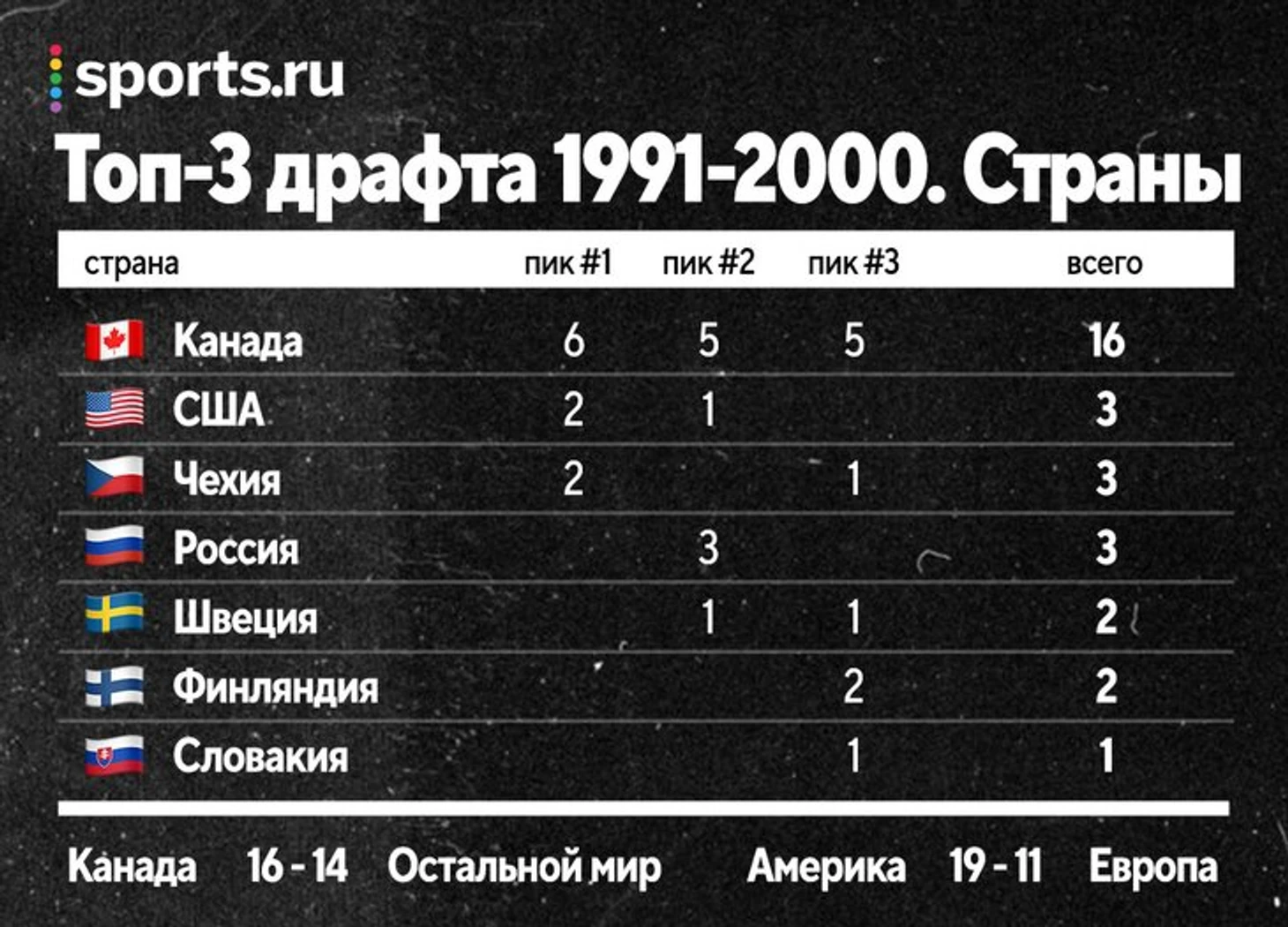 Даже в 90-х на волне новых возможностей и повышенного интереса к игрокам из России никакой реальной конкуренции канадским игрокам не получилось. И все же европейцы кое-что «отъели»: в 1980-х в первой тройке выбрали 23 канадцев, там Европа только начинала подтягиваться (выбрали шведа Сундина в 1989-м и чеха Недвева в 1990-м). В смысле массовости – да, Европа и особенно Россия забрали много, но если говорить о самых-самых талантах, перемены не были кардинальными.