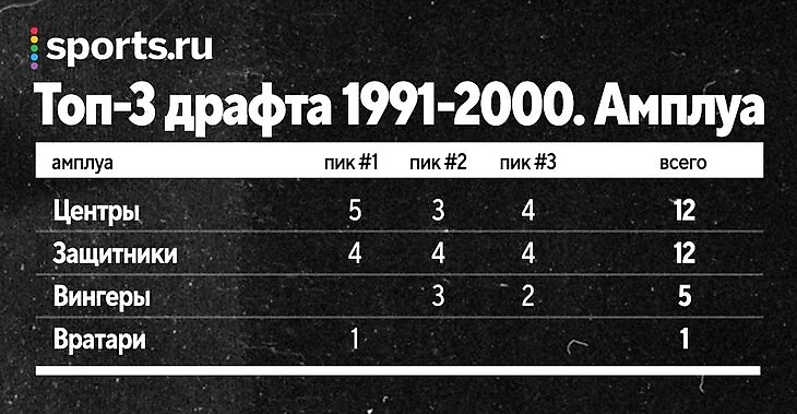 Вингеры в 90-х вообще не котировались. А вратарей во все времена выбирали высоко крайне редко. В этом десятилетии – Рик ДиПьетро, в следующем – Марк-Андре Флери и Кари Лехтонен. После Флери (драфт-2003) вратарей в первой тройке не было. Даже Кэри Прайс в 2005-м ушел только пятым.