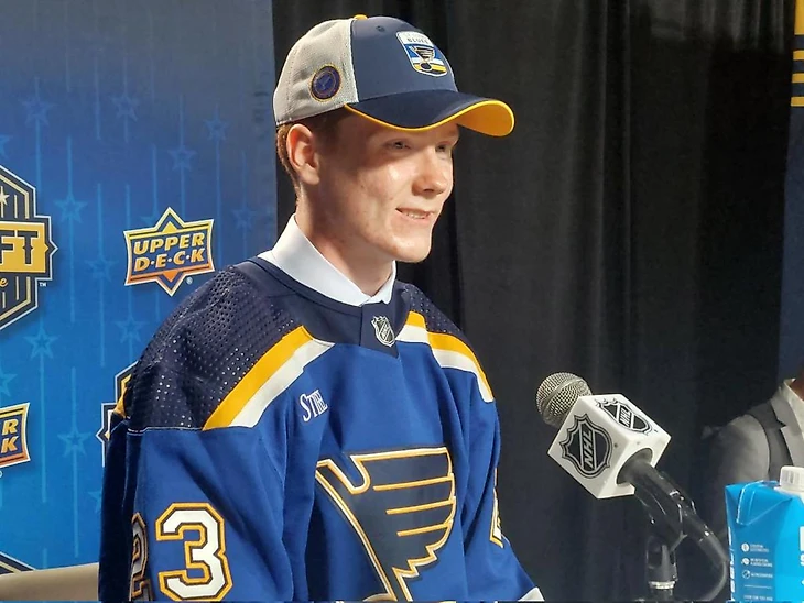 106. Якуб Штанцль (Чехия, C/LW, «Векшё U-20», J20 Nationell). Габаритный двухсторонний форвард, на счету которого уже есть один забитый гол в SHL. Обладает шикарным видением площадки и регулярно обманывает своих противников сложными финтами. Несмотря на плохое катание, вполне может пригодиться «Блюзменам» в качестве многофункционального игрока нижних звеньев через 3-4 года.