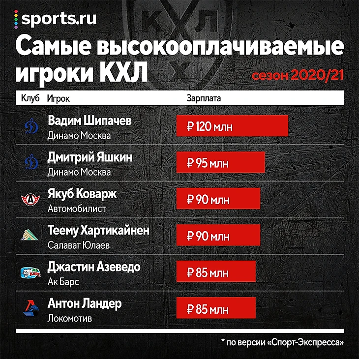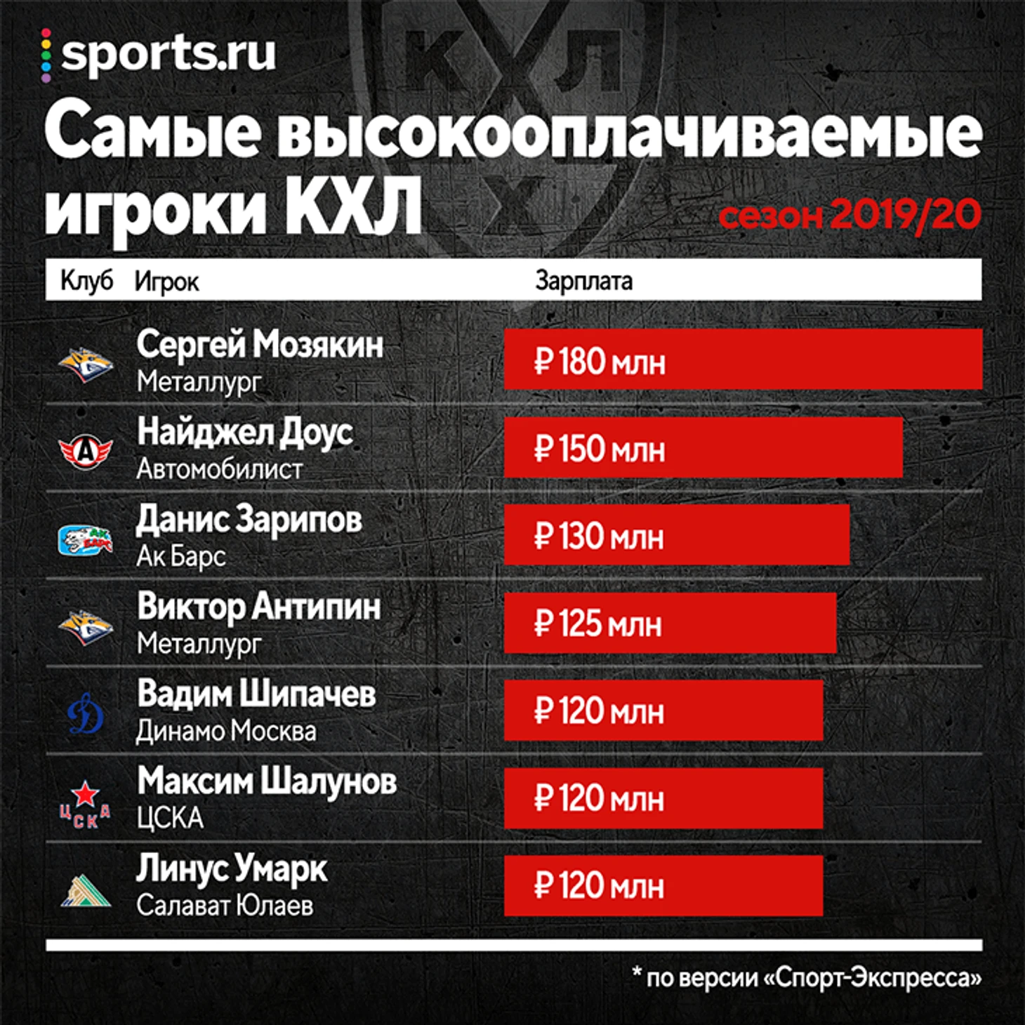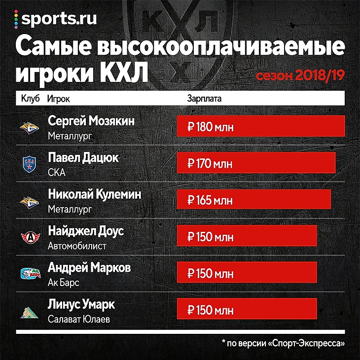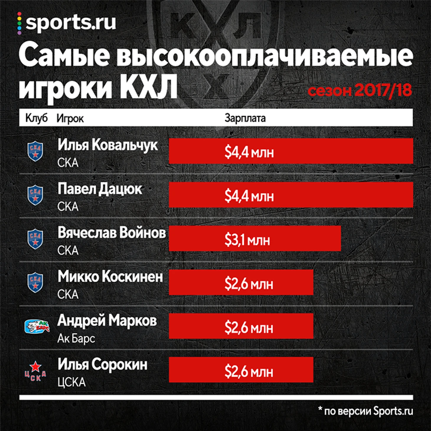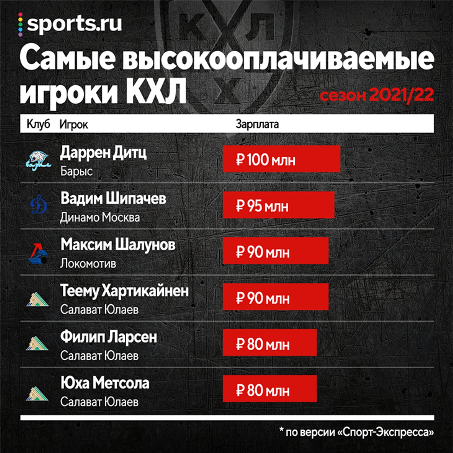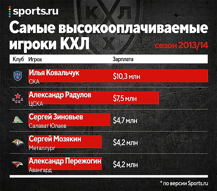 В 2013-м первые два места занимали Ковальчук и Радулов, и платили им очень много даже по меркам НХЛ. Хотя и зарплаты остальных игроков из топ-5 того рейтинга в нынешних условиях сложно представить.