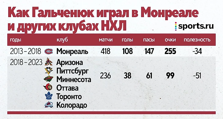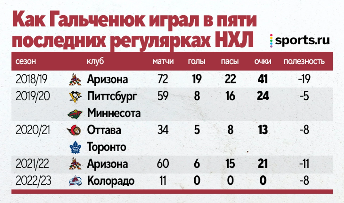 Мы не учитывали достижения Гальченюка в плей-офф, потому что их почти не было. Последний раз он играл в Кубке Стэнли еще в составе «Торонто» в сезоне-2020/21 (6 матчей, 1+3).