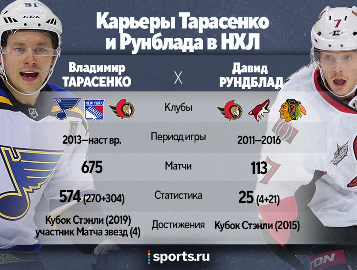 В таблице мы не учитывали матчи в плей-офф. По ним Тарасенко громит Рундблада еще внушительнее: 97:8. Зато оба остались в истории обладателями Кубка Стэнли, хотя внесли в это различный вклад. Давид отыграл в чемпионском плей-офф всего пять матчей и не набрал ни одного очка. Тарасенко же был одним из лучших в «Сент-Луисе»: 26 игр, 17 очков (11+6).