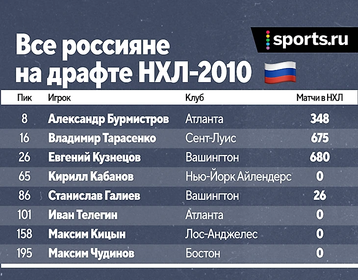 Драфт-2010 получился парадоксальным для русских игроков. «Атланта» взяла Александра Бурмистрова под восьмым номером, а на Артемия Панарина просто никто не посмотрел – тот попал в НХЛ лишь в 2015 году. Панарин в итоге сейчас зарабатывает 11,6 млн в «Рейнджерс», а Бурмистров едва тянет даже в КХЛ.