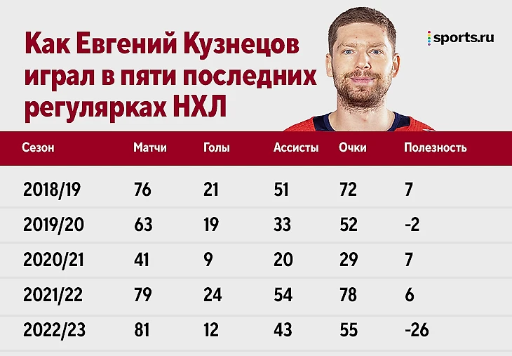 За последние два года мы увидели разного Кузнецова. В сезоне-2021/22 Евгений провел мощную регулярку, где постоянно помогал Овечкину. В тот момент он много рассказывал о мечте быть рядом в момент его рекордного гола. Предпосылок для скорого обмена не возникало, хотя в плей-офф «Вашингтон» неудачно сыграл с «Флоридой».
