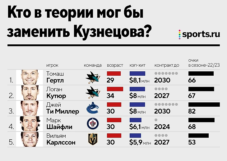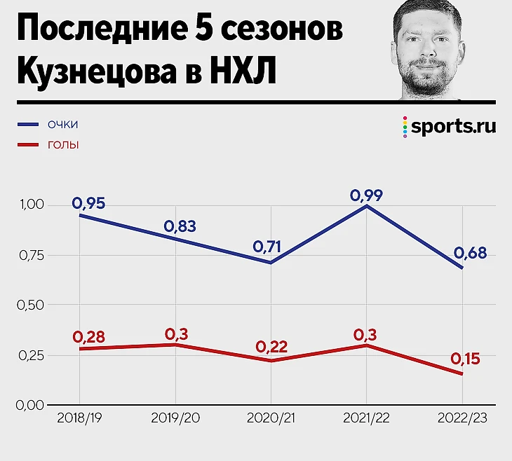 У Кузнецова некрохотный контракт в 7,8 млн в год, который истекает только в 2025 году. Он третий бомбардир команды в регулярке-22/23, что в относительном выражении звучит неплохо. Но 55 очков по факту маловато. 12 голов – очень мало.