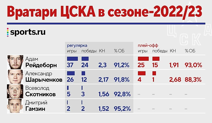 Последний плей-офф ЦСКА тоже начинал с Шарыченковым, но уже по ходу третьей игры вернул Рейдеборна – швед тоже не образец стабильности, но выручал в нужный момент.
