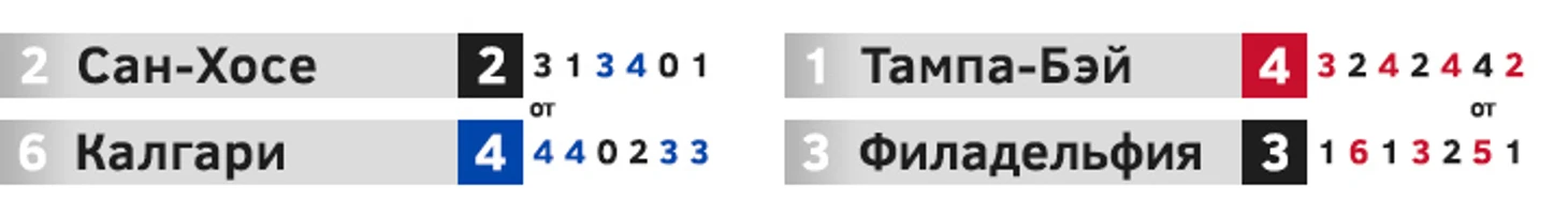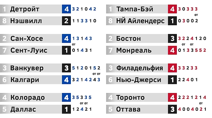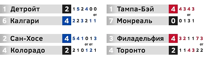 «Тампа» вновь налегке прошла соперника. Свой шанс зацепиться за серию «Монреаль» упустил в третьем матче, позволив Лекавалье сравнять счет в самой концовке. Ричардс добил «Канадиенс» уже на второй минуте овертайма. В остальных поединках исход был ясен задолго до финальной сирены, «молнии» впервые оказались в финале конференции. У Николая Хабибулина после 9 матчей: 96,4% отраженных бросков и одна пропущенная шайба в среднем. «Филадельфия» и «Торонто» обменивались домашними победами вплоть до шестого матча, в котором случился дубль Джереми Реника с победным голом в овертайме. Лидерам «Торонто» Сундину и Могильному не хватило помощи от остальной команды, «Флайерс» оказались глубже, быстрее и мощнее. Пенсильванцы обычно не жаловали игроков с российским паспортом, но в этот раз приобрели по ходу сезона сразу троих. Защитники Малахов и Даниил Марков были лидерами команды по показателю полезности в плей-офф, а центрфорвард Жамнов делил первое место с Игинлой в списке бомбардиров после двух раундов.