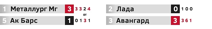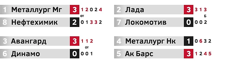 В других парах преобладали реваншистские настроения. Годом ранее «Локомотив» на пути к чемпионству выбил «Ладу» в трех матчах. Тольяттинцы смогли ответить тем же, Воробьев легко переиграл Шуплера. Вновь отличился Трвай, он отыграл на ноль в обоих домашних матчах, а в последней встрече отразил все 5 буллитов. Перед серией с «Авангардом» в «Динамо» размышляли о том, как остановить грозную атаку оппонента. Вряд ли кто-то мог ожидать, что Белоусов превратит самую забивающую (и самую пропускающую среди участников плей-офф) команду в оборонительного монстра. Бело-голубые были успешно засушены, реванш не удался – омичи снова отправили «Динамо» в отпуск.
