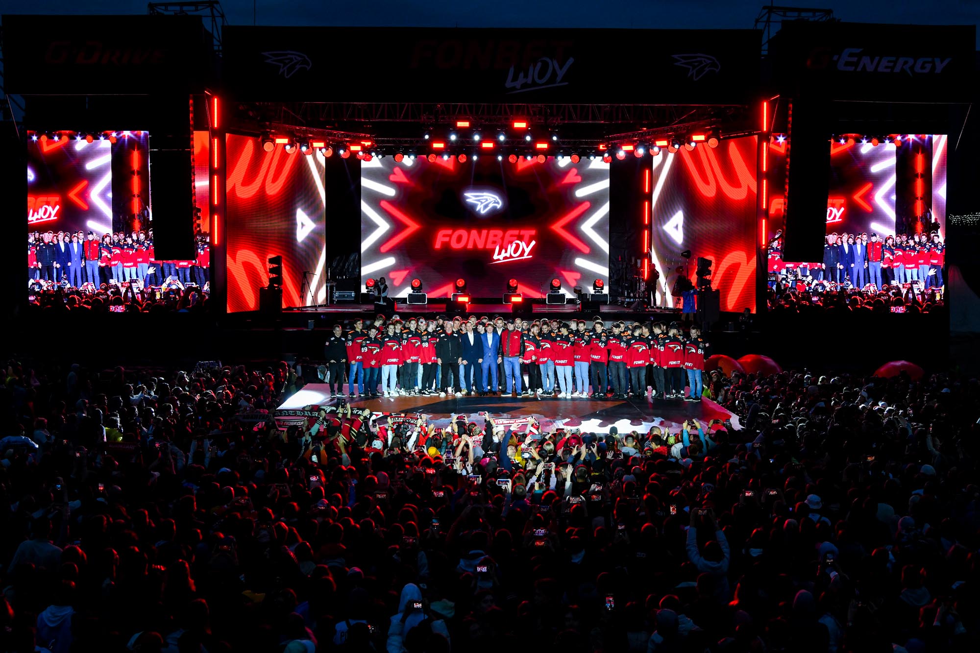 Если год назад хоккеисты «Авангарда» появлялись на сцене на коньках, то сейчас выросли прямо из-под сцены на импровизированном лифте. Всё это напоминало знаменитую сцену из «Терминатора», только в обратной перемотке, и смотрелось стильно, красиво, эпично.