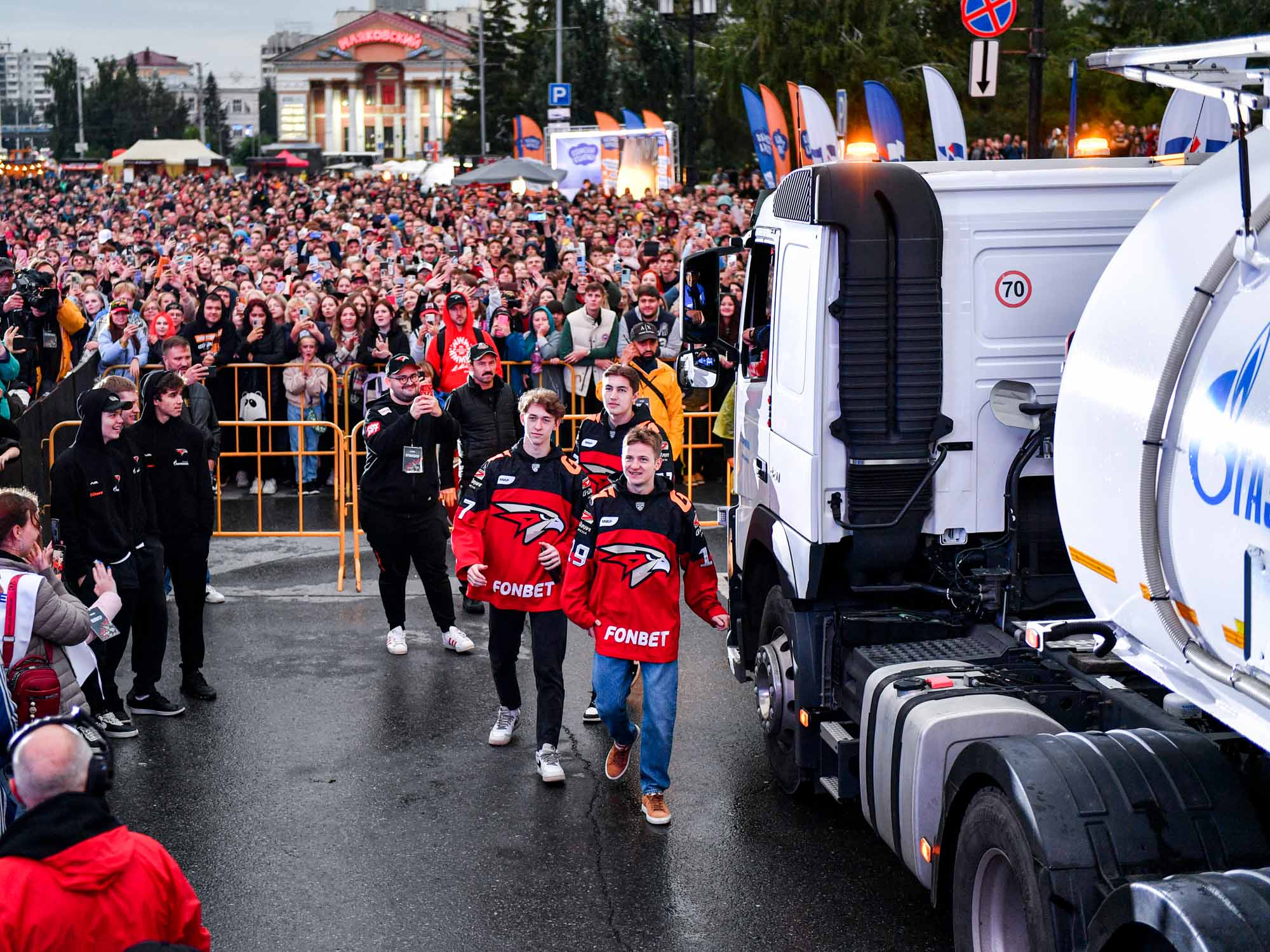 Но эффектнее всех на церемонии появились Владимир Ткачёв, Никита Холодилин и Илья Рейнгардт. Трио воспитанников «Авангарда» приехало на Соборную площадь прямо на бензовозе «Газпромнефти»! И очень вовремя, так как публика явно успела поволноваться насчёт отсутствия главной звезды, когда уже вроде бы вся команда собралась на сцене и снимала на смартфоны людское море.