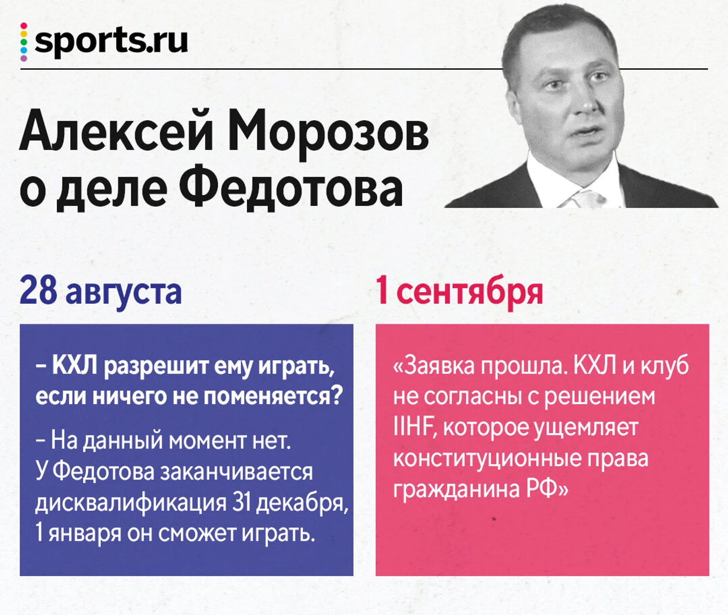 «Команда ЦСКА подала заявку на матч и включила в нее Ивана Федотова. КХЛ приняла заявку, по базе заявка прошла. Поэтому Иван Федотов сегодня сыграет в матче.