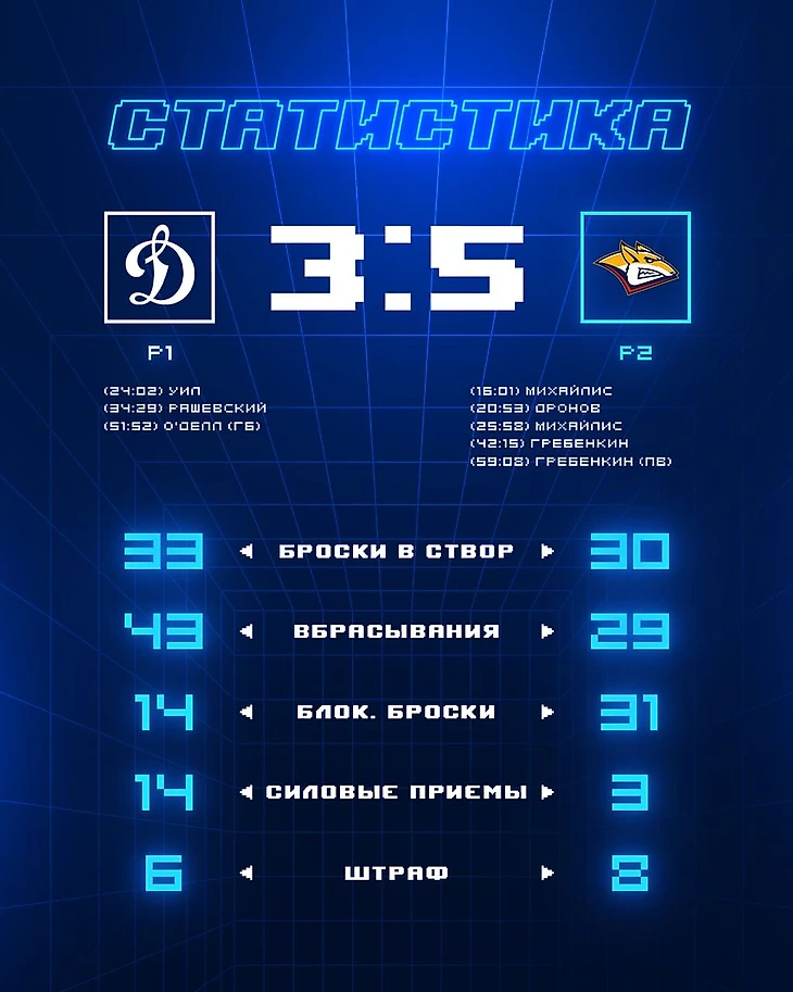 В третьем периоде гости забросили четвёртую шайбу, которая и оказалась победной. Пятая шайба в концовке лишила динамовцев всех надежд отыграться.