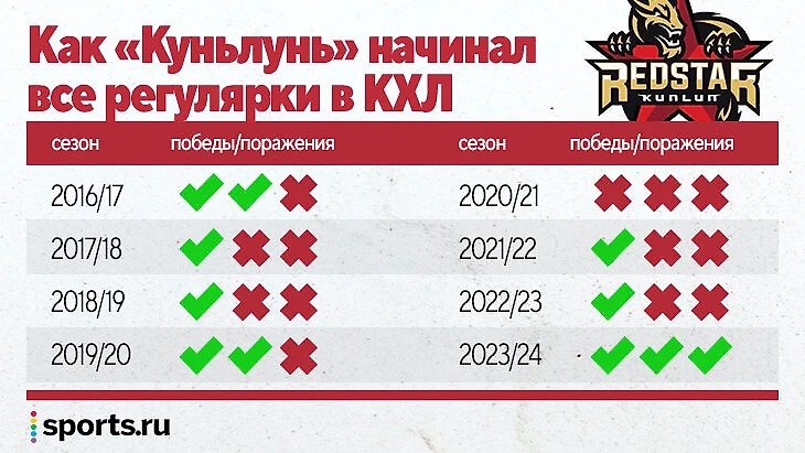 ● Сезон-2020/21 – единственный, когда «Куньлунь» не выиграл ни одного из трех стартовых матчей регулярки. Тогда все складывалось совсем плохо. Первая игровая победа в регулярке – 15 октября 2020 года над «Салаватом» (5:3). Что до этого: 13 поражений и технический успех над «Локомотивом» (5:0). Ярославский клуб просто не приехал на ту игру из-за ковида.