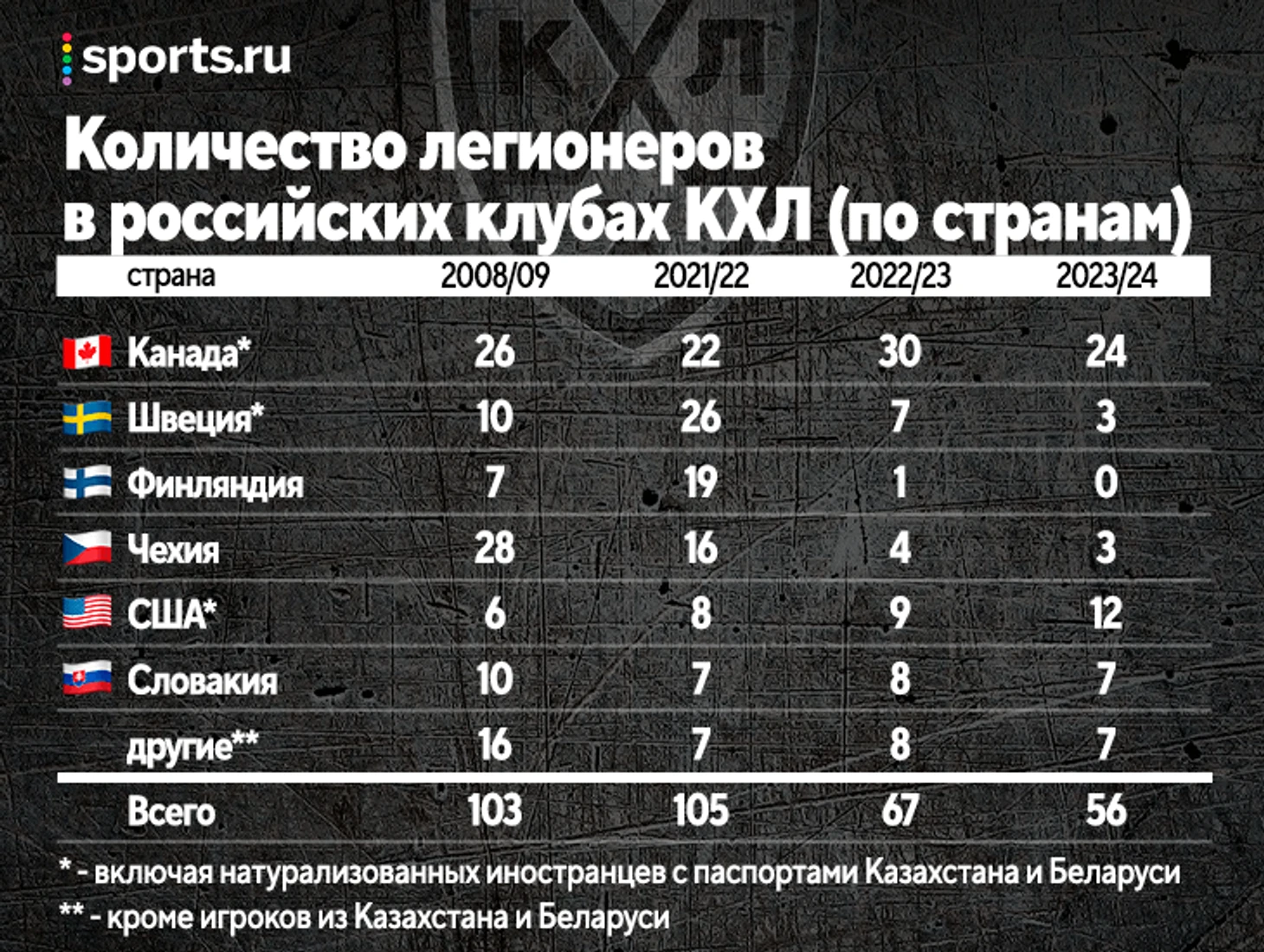 Показательно в этом смысле распределение иностранцев среди тех, кто приехал в российские клубы КХЛ после 24 февраля 2022-го. Две трети – из Канады и США. И это мы не брали для чистоты эксперимента минское «Динамо» и «Барыс», где, во-первых, нет лимита, во-вторых традиционно много именно североамериканцев. В этих двух клубах в начале сезона заявлено 13 игроков из Северной Америки, и 11 из них приехали в КХЛ после 24 февраля 2022-го, а еще один прошлым летом сменил покинувший лигу «Йокерит» на «Барыс».