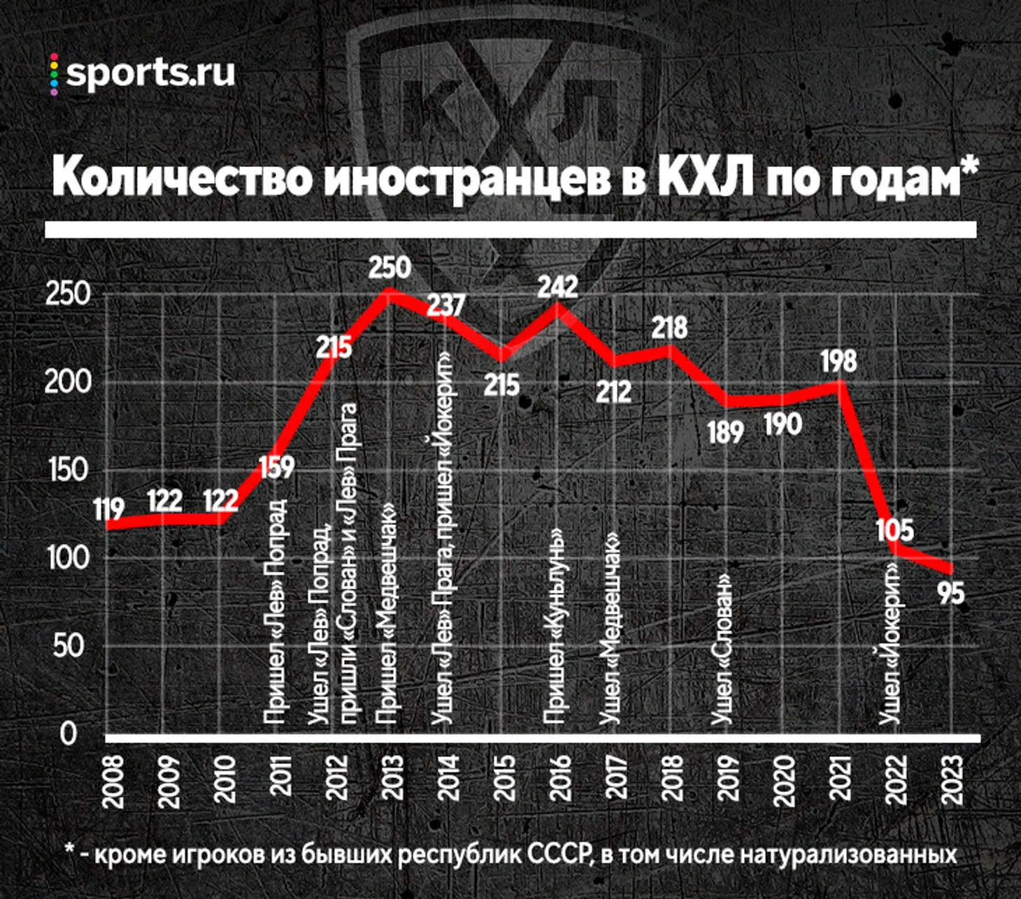 Но что интересно: до того, как случилось то, что случилось в феврале 2022-го, в целом по лиге было намного больше иностранцев, чем в первых сезонах. И даже сейчас их не намного меньше, чем в 2008-м – и это при сокращенном лимите и с учетом начала сезона (по итогам полного иностранцев всегда больше, чем на старте).