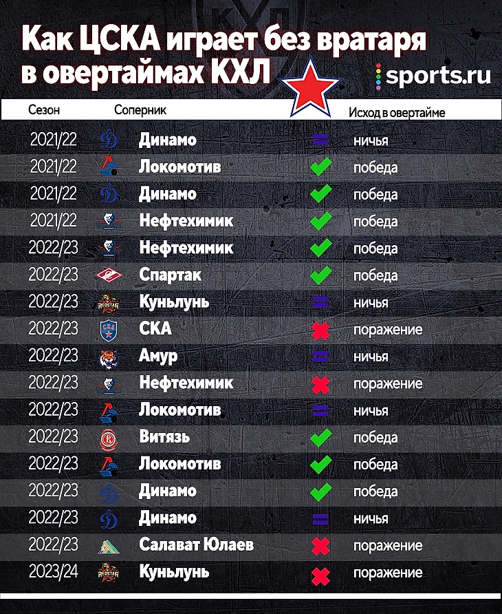 Подсчитываем актуальную статистику по овертаймам со снятым вратарем у ЦСКА: 17 матчей, 8 побед, 5 ничьих, 4 поражения.
