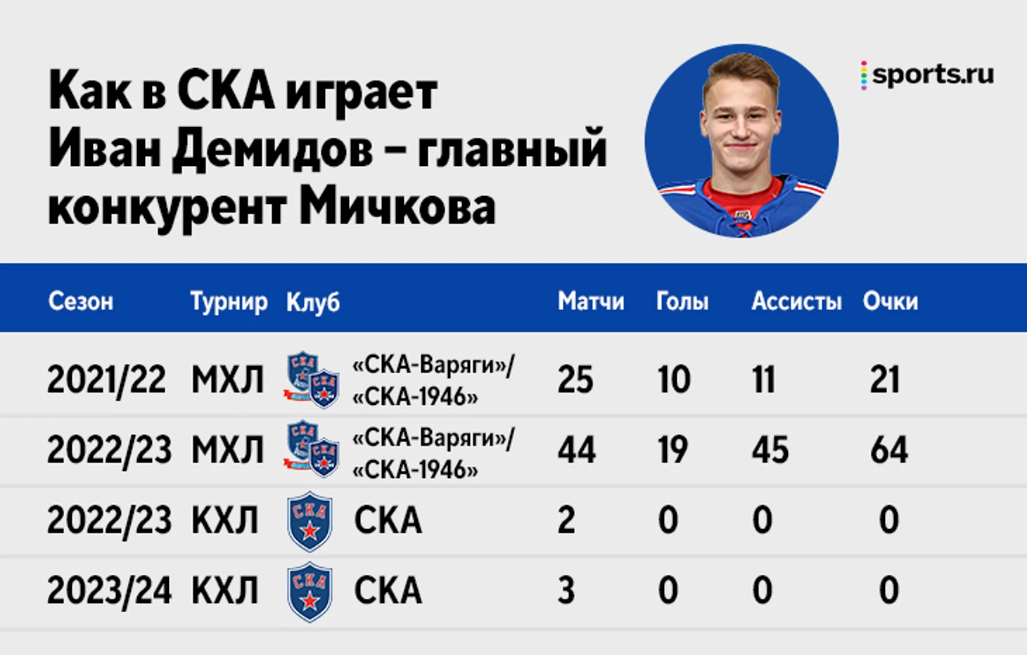 17-летний Демидов готовится к выходу на драфт НХЛ-2024. Он котируется там в первой пятерке. Ротенберг уже сравнивает Ивана и других игроков СКА – в его реальности они на одном уровне. На фоне частых претензий к Мичкову ярко смотрится похвала для Демидова после одной из игр: «Иван проявил себя с наилучшей стороны. Он внес вклад в победу, мы видим его прогресс».