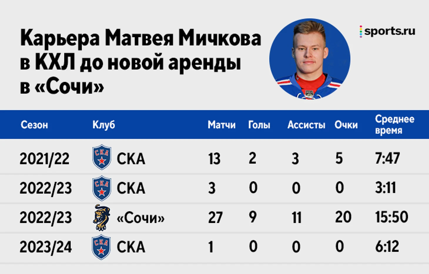 Матвей Мичков – игрок «Сочи». Он отправляется туда в аренду из СКА. Так уже было в сезоне-2022/23, но летом Мичков вернулся и наигрывался в составе. Когда стартовала регулярка КХЛ, Матвей часто оказывался вне заявки СКА. Ротенберг выпустил его всего в одной игре против «Торпедо» – там Мичков провел на льду чуть более шести минут и ничем не запомнился.