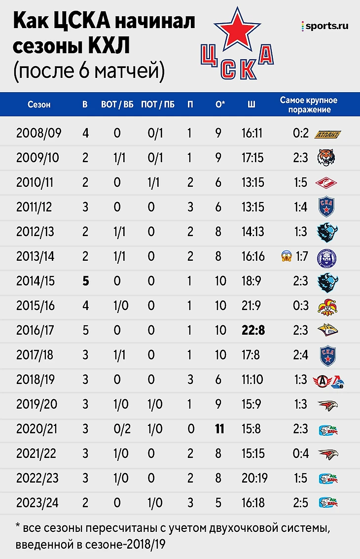 Похожий на нынешний результат был в сезоне-2010/11 – но тогда ЦСКА хотя бы доводил дело до овертаймов и буллитов. Кстати, в том чемпионате команда не пробилась в плей-офф.