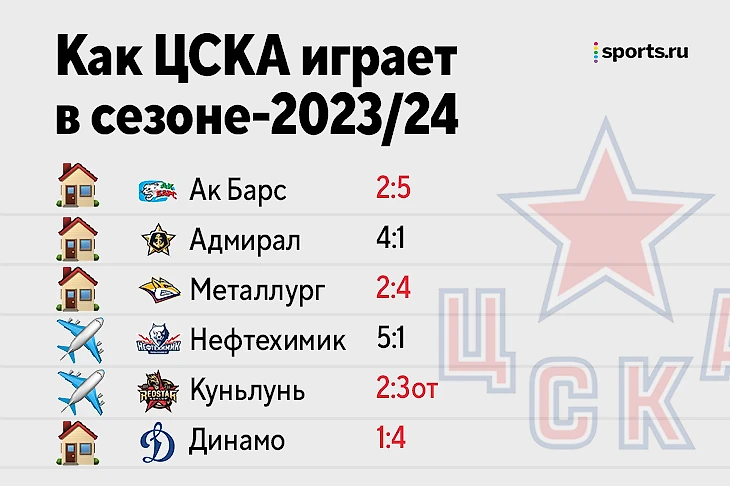 Конечно, катастрофы пока нет – это только 6 матчей из 68 в сезоне, даже меньше 1/11. Более того, одно поражение – от «Куньлуня» – чисто тренерская прихоть: ЦСКА всегда снимает вратаря в овертаймах, когда получает контроль над шайбой, когда-то это должно было закончиться пропущенным. Другой вопрос, что у действующего чемпиона и китайцев из Мытищ вообще дошло до овертайма.