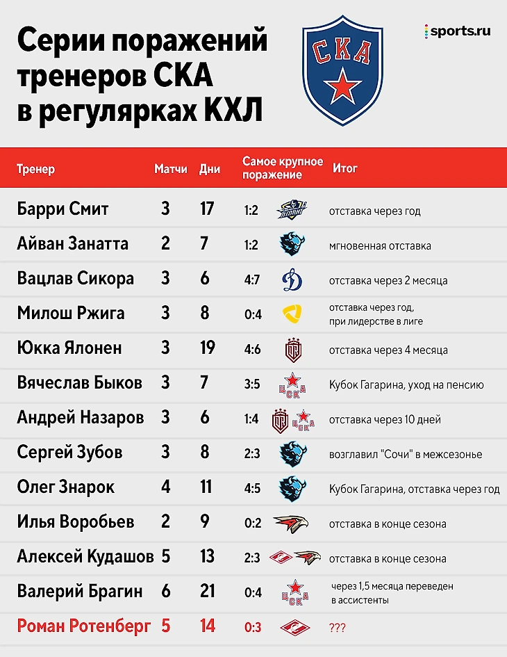 Вообще для Питера эпохи КХЛ совершенно нехарактерны затяжные черные полосы – даже в первых сезонах при Смите, Занатте, Сикоре, Ржиге СКА не проигрывал больше трех раз подряд. Правда, у некоторых тренеров могла быть и парочка таких серий за регулярку.