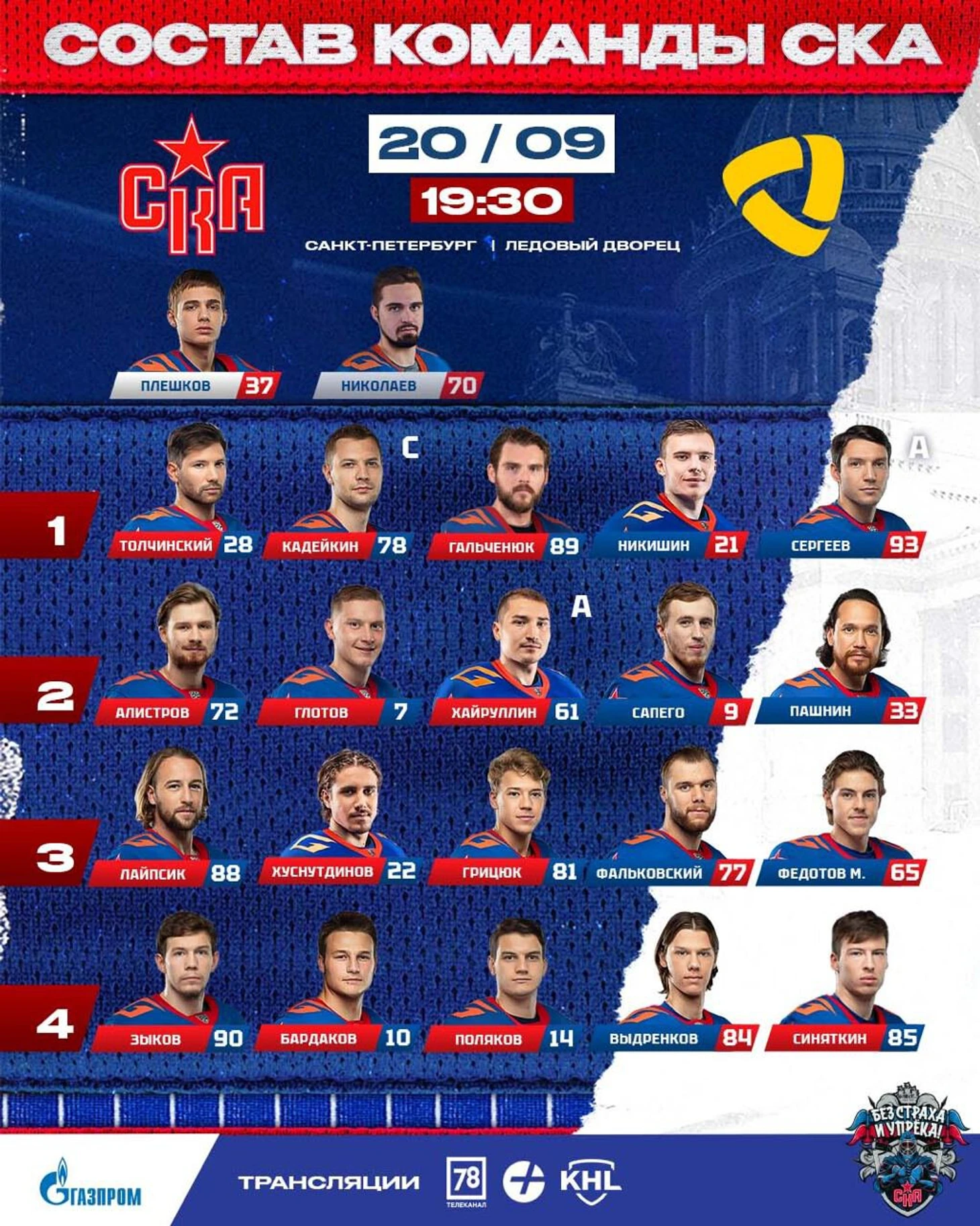 ● топ-9 нападения снова перемешали. К устоявшейся в последние матчи связке Кадейкина и Гальченюка добавили Толчинского, но Алекса при этом перевели на правый фланг. И Глотов, и Алистров, и Хайруллин играли в последних матчах друг с другом – но ни разу именно в таком сочетании. А вот Лайпсик, Хуснутдинов и Грицюк прежде не пересекались в играх как одно звено, но в СКА все когда-то бывает в первый раз.