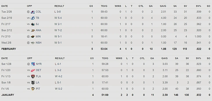 Личную статистику я привык смотреть на ESPN. Особенно когда дело касается вратарей. В профиле у каждого игрока исчерпывающая статистика с разбивкой по месяцам.