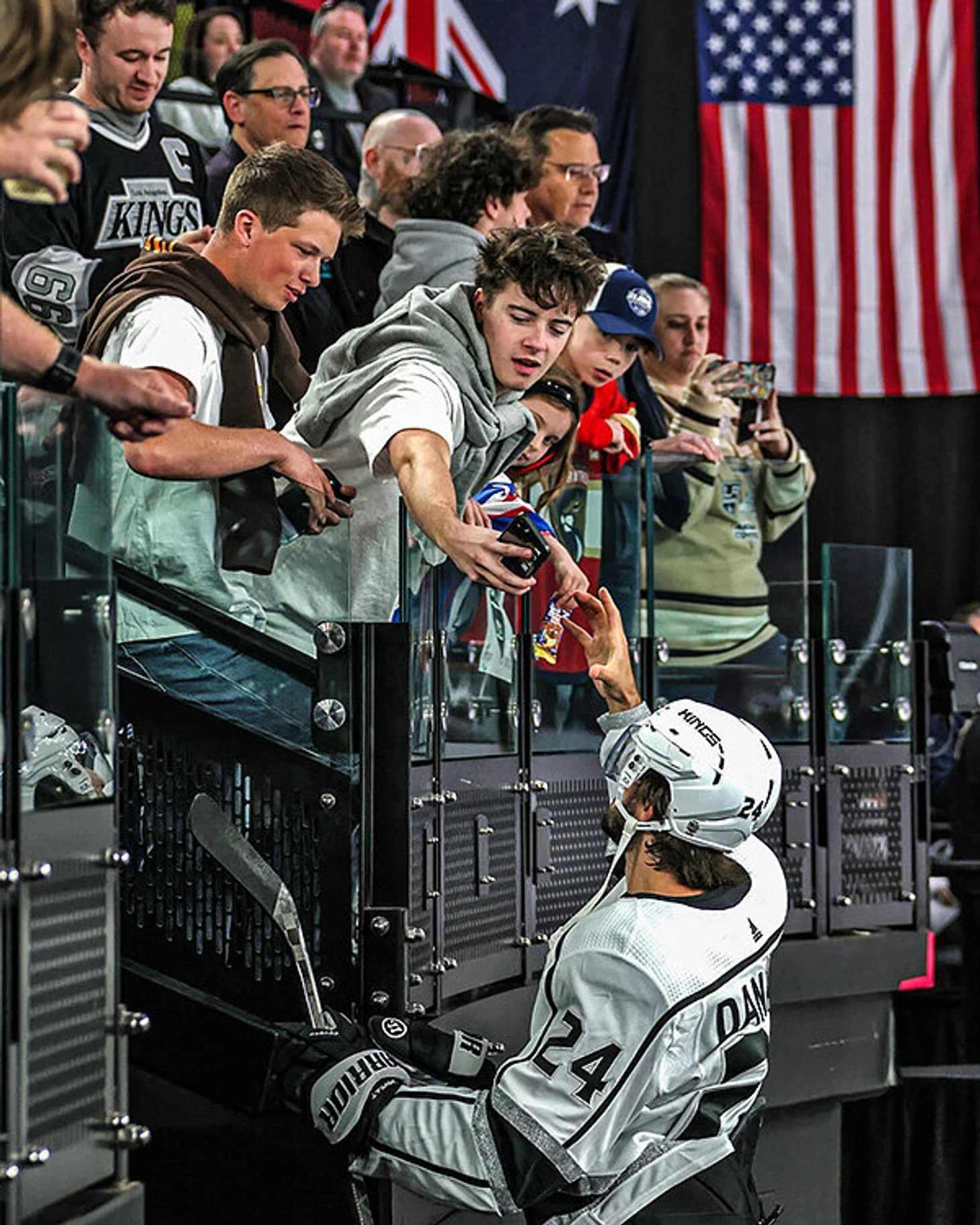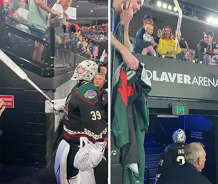 После матча хоккеисты «Аризоны» Трой Стечер и Коннор Ингрэм подарили фанатам клюшки.