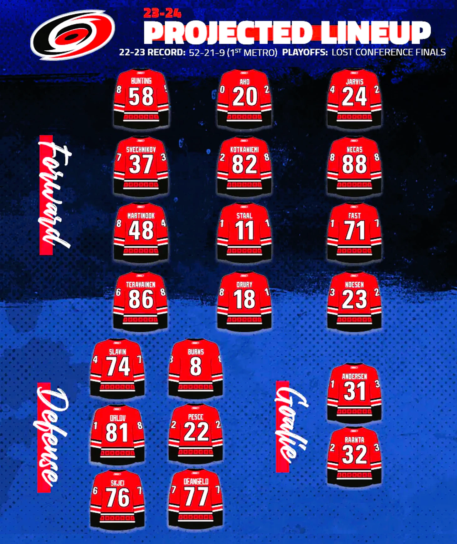 Перед последним контрактным годом главного тренера Рода Бриндамора в Каролине серьезно подготовились к очередной возможности побороться за кубок. Постаравшись улучшить и пересобрать один из самых сбалансированных составов в лиге, особенно в обороне, а также сохранив всю вратарскую бригаду (Андерсен, Раанта, Кочетков)