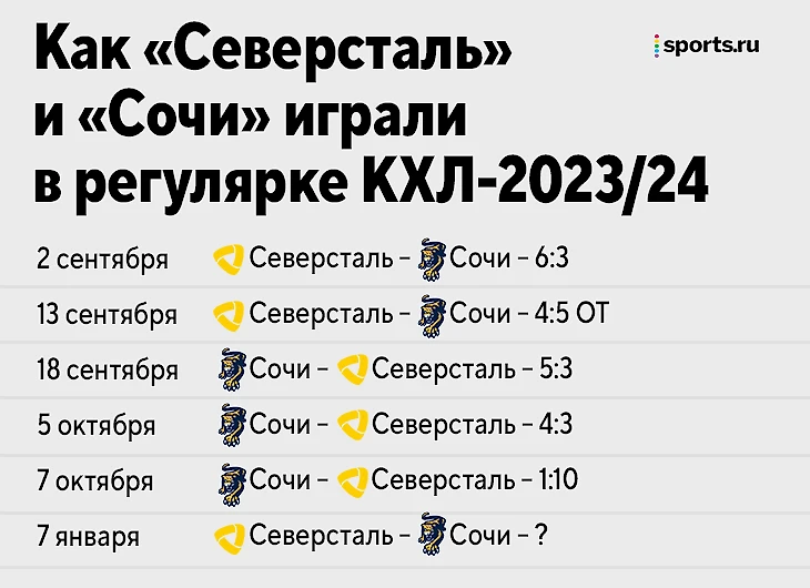 «Северсталь» и «Сочи» сыграли между собой уже пять игр в регулярке-2023/24. Итог: две победы «Северстали» и три – «Сочи». В сумме за все матчи команды забросили 44 шайбы. Минимальным результатом стали 7 голов в матче 7 октября (4:3). «Северсталь» прямо сейчас остается второй по результативности командой в КХЛ (53 гола). Больше шайб только у «Спартака» – 56.