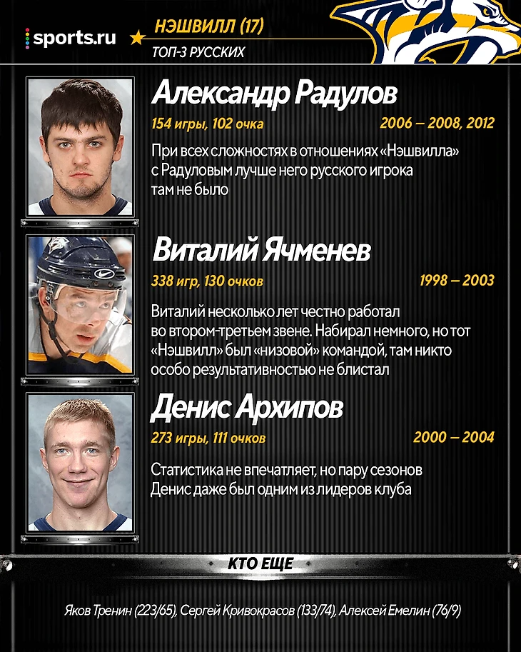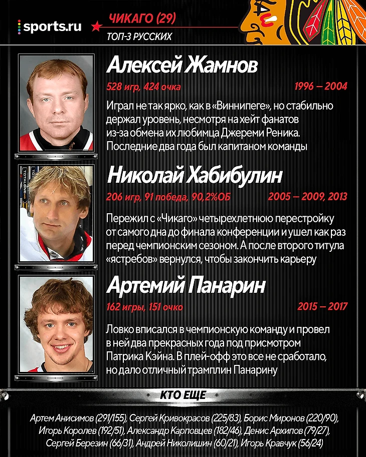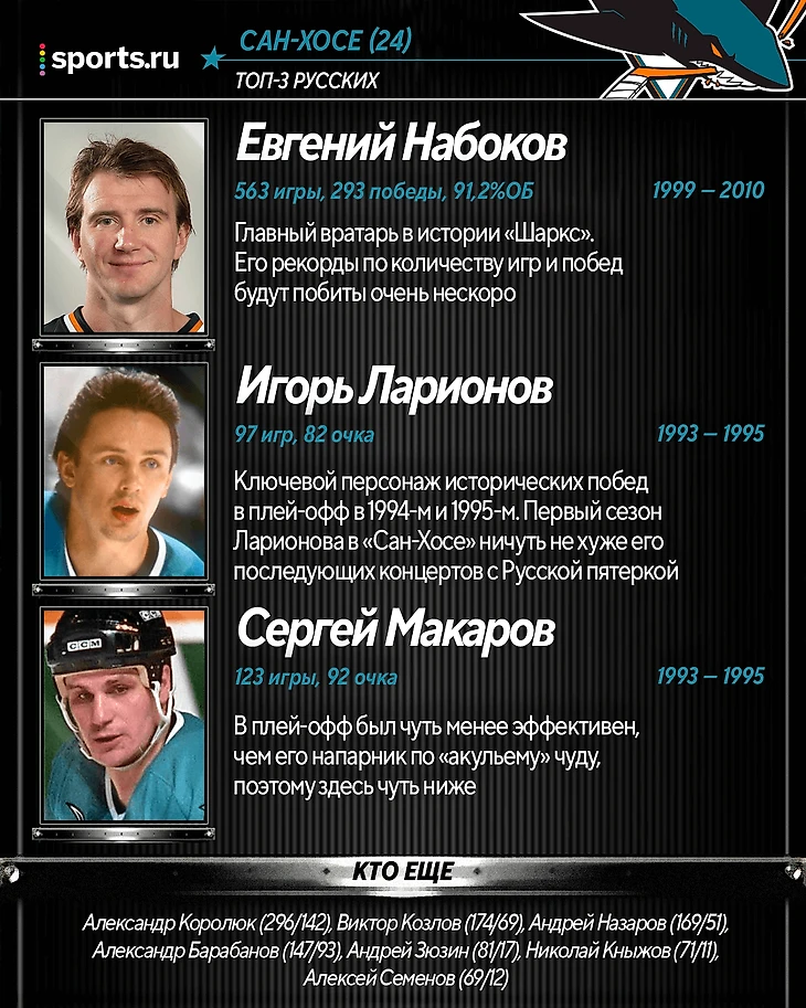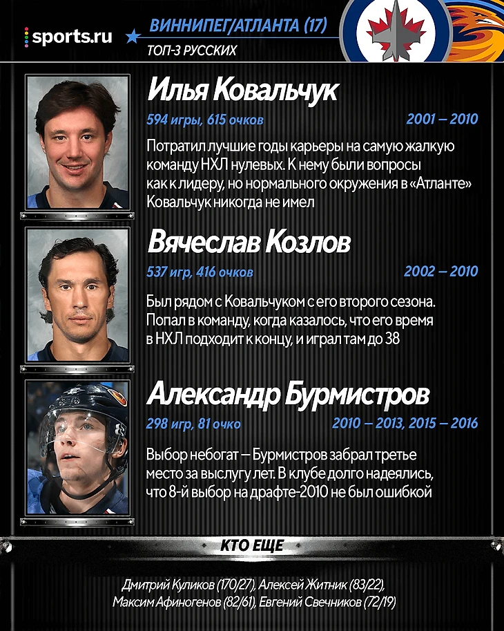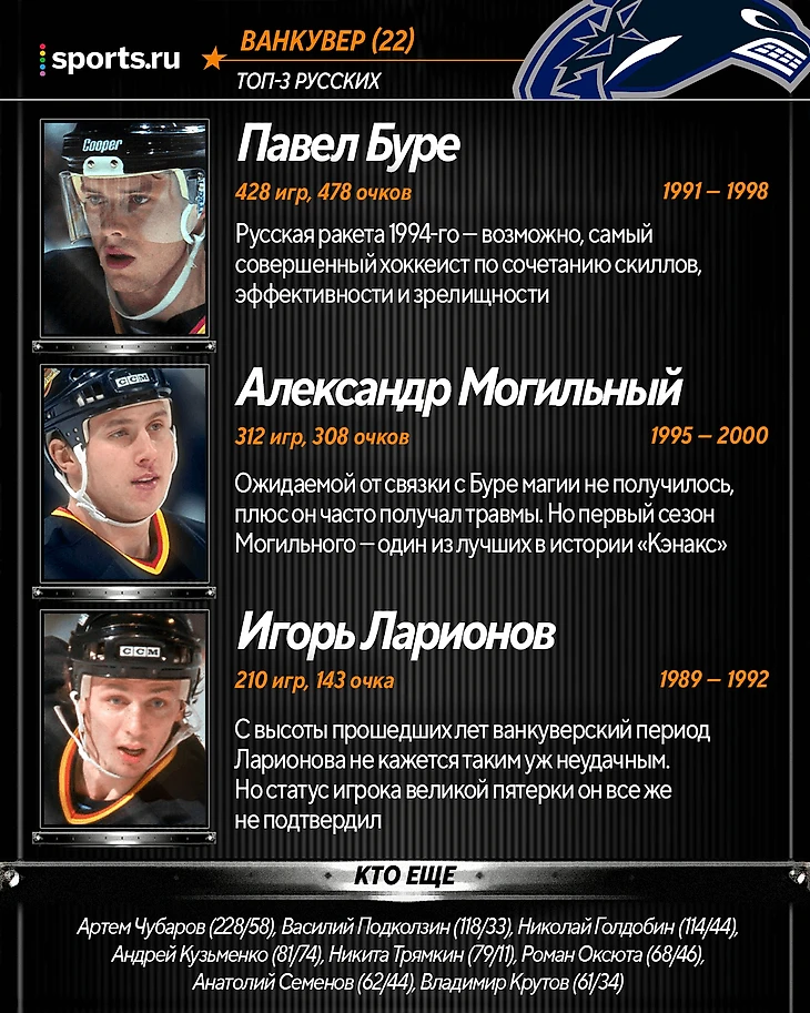 ● по критериям все просто: больше одного полного сезона для топ-3 (поэтому «Ванкувер» пока без Кузьменко) и минимум 60 матчей для упоминания среди остальных. Исключения будут, но только в особых случаях.