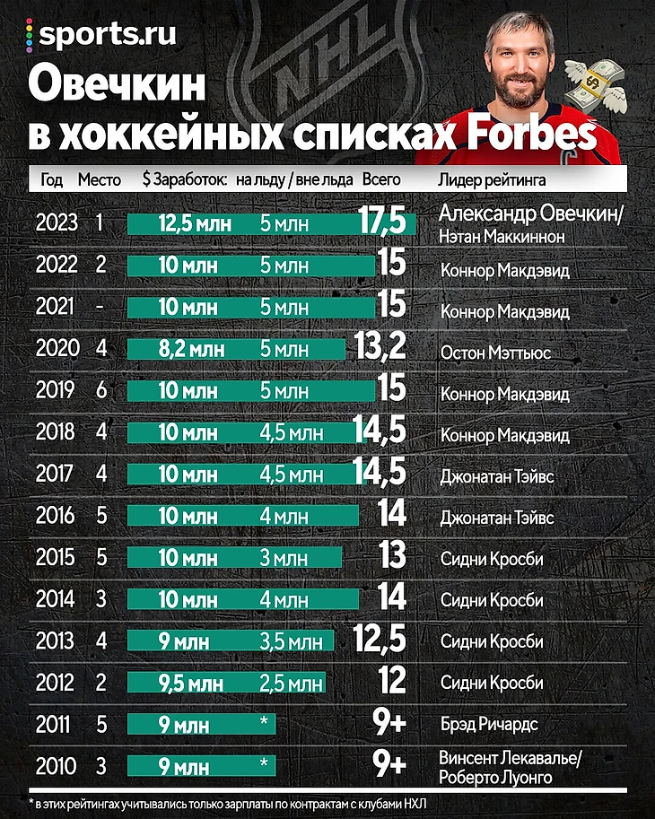 Forbes составляет хоккейный список с 2010 года, и сторонние доходы в нем поначалу не учитывались. За все время подсчетов Овечкин только однажды не попал в топ-10: долго боролся с Сидни Кросби, но, как только доходы капитана «Питтсбурга» упали, внимание рекламодателей переключилось на другого канадца – Макдэвида.