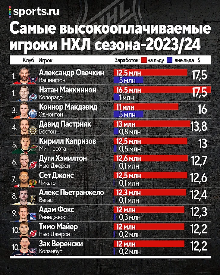 Лидерство Овечкина не единоличное. Звезда «Колорадо» Нэтан Маккиннон получит такую же сумму. При этом от «Вашингтона» у Александра только 70% доходов – остальные деньги ему принесут личные спонсорские контракты и бизнес-проекты.
