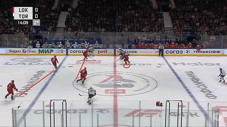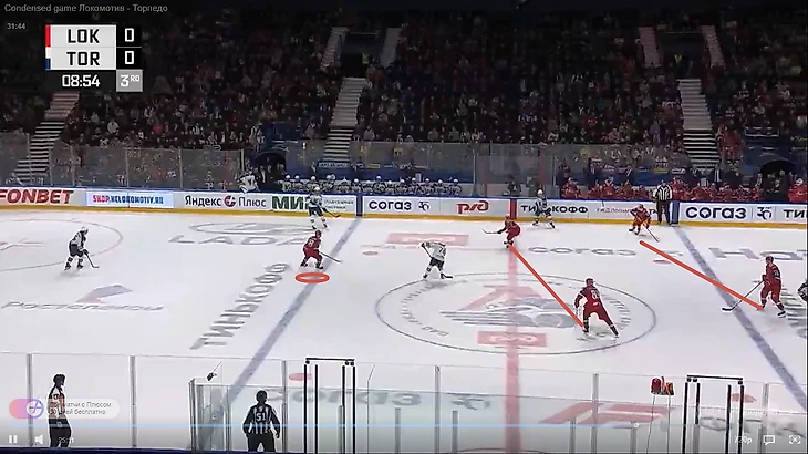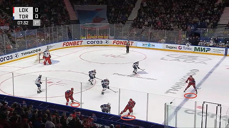 Посмотрите на игру в третьем периоде, когда оборонительные команды обычно садятся ближе в оборону, чтобы не пропустить в концовке, «Локомотив» остаётся играть в 1-2-2 и не переходит на оборонительную схему.
