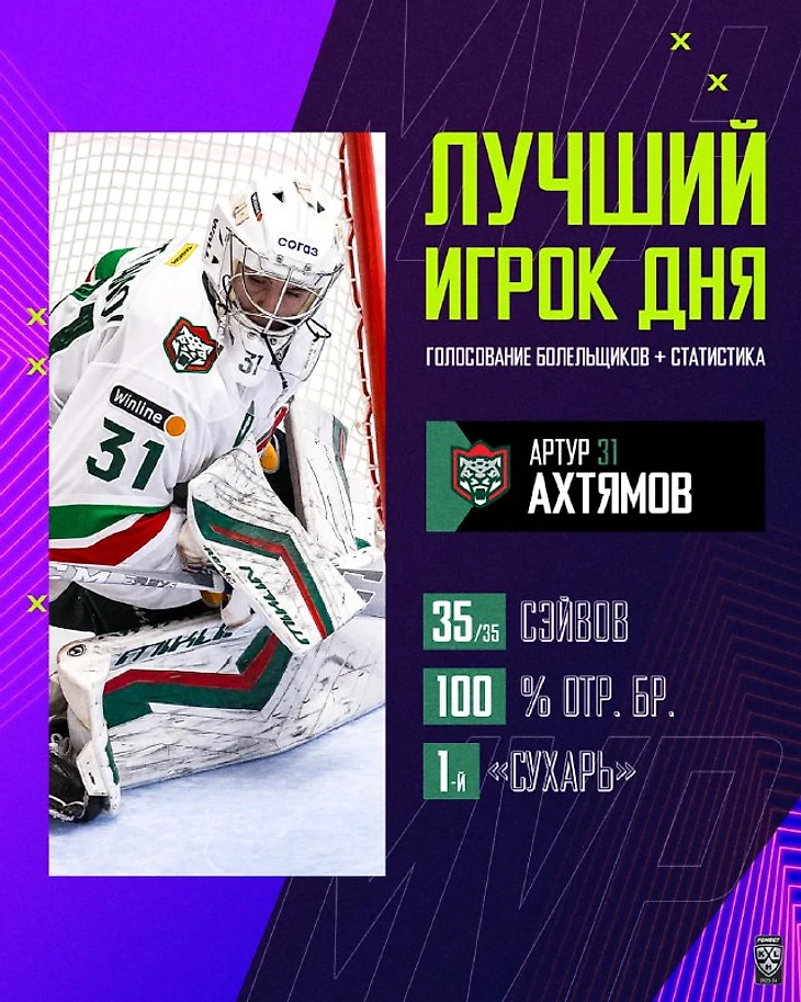 Вратарь «Ак Барса» Артур Ахтямов был выбран болельщиками Континентальной Хоккейной Лиги лучшим игроком игрового дня.
