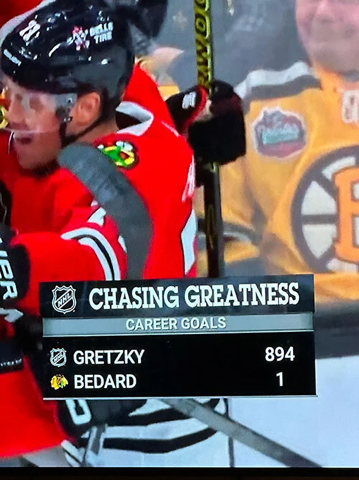Так поступил канал TNT. Во время студии, посвященной матчам НХЛ, в углу экрана возникла графика «В погоне за величием». Там сравнивались показатели Уэйна Гретцки (894 гола) и Коннора Бедарда (1 гол). Пользователи реддита утверждают, что подобная графика встречалась и на предыдущем матче Бедарда. Тогда рядом стояли очки Коннора (тогда – одно) и Кросби.
