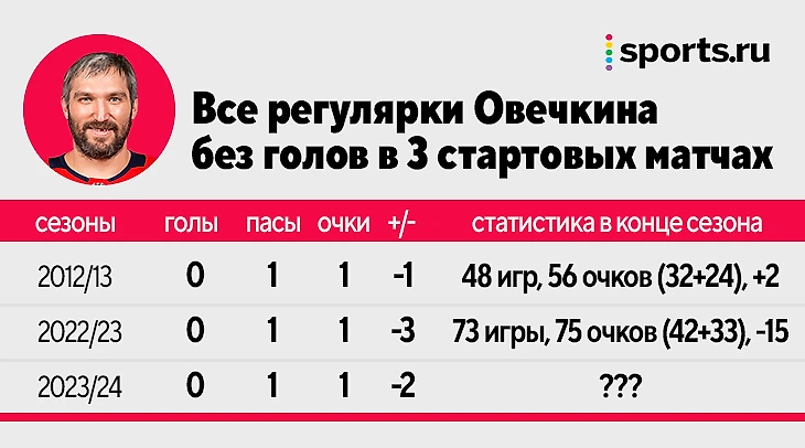 Тяжелый старт Овечкина не всегда что-то значит. Сезон-2012/13 начался позже из-за локаута. Во время переговоров Овечкин возвращался в «Динамо» и выступал в КХЛ. Затем на сокращенном отрезке той регулярки НХЛ Александр отыграл так, что взял «Морис Ришар» – приз лучшему снайперу лиги. Тогда он забил лишь в пятой игре, а «Вашингтон» начал турнир с 4 поражений.