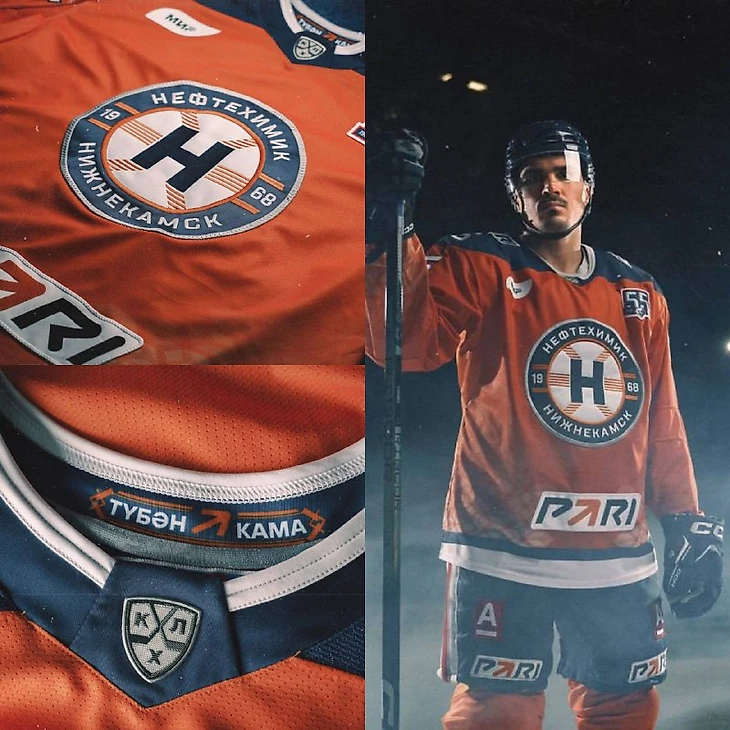 Антураж юбилея передает и внешний вид хозяев - джерси оригинальных морковных цветов с нанесением буквы «Н», которая украшала форму команды 55 лет назад. На воротники нанесены название города Нижнекамска на татарском языке и традиционные национальные узоры, а на плечах и на спине – специальные паттерны с изображением цепи макромолекул синтетического каучука.