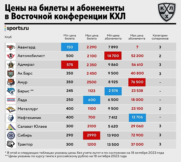 ● Более половины стадионов в зависимости от предполагаемого зрительского интереса делят гостевые команды на категории. Чаще всего их три. Абсолютный рекорд лиги по этому показателю держит ЦСКА. В группу «топ» армейцы ввели «Ак Барс», СКА и «Спартак», установили отдельные цены для игр с московским «Динамо», а остальных соперников распределили на 5 категорий.