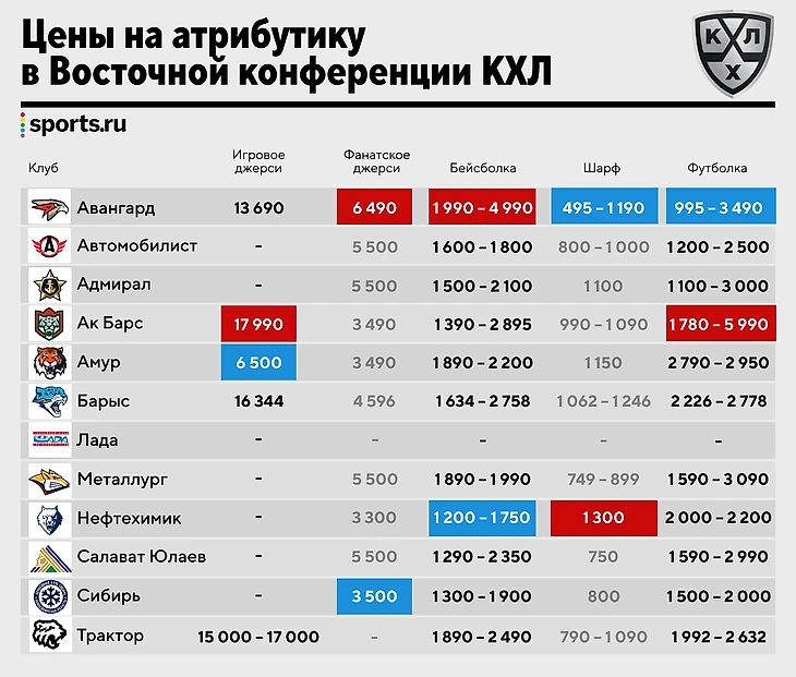 Нет прямой зависимости между результатами команды и ценами на ее атрибутику. Например, стоимость фанатских джерси вице-чемпиона «Ак Барса», вылетевшей в первом раунде «Сибири» и не попавшего в плей-офф «Амура» – на одном уровне.