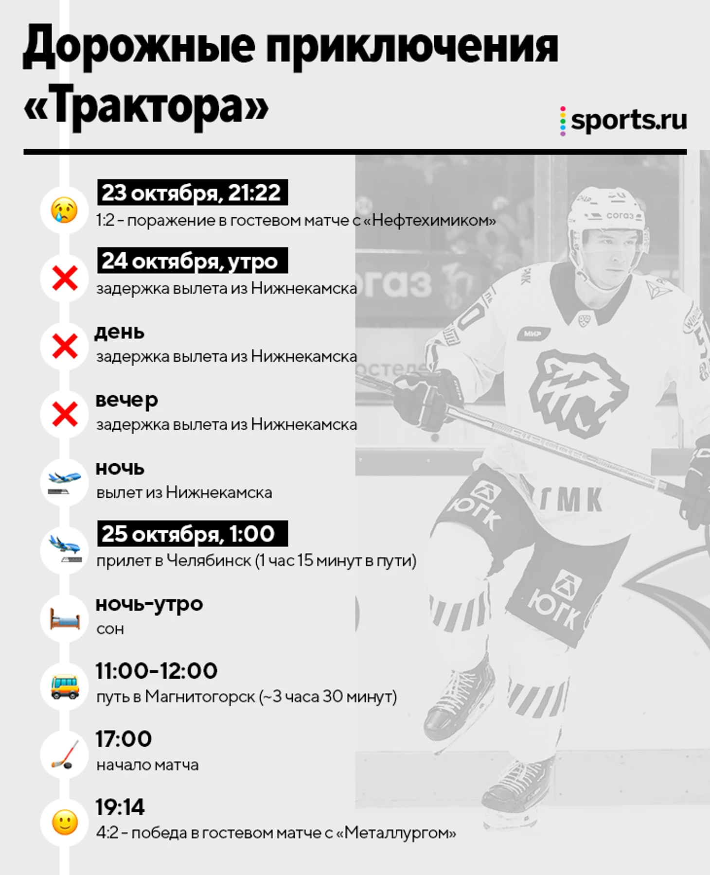 Дорожные приключения челябинцев – главная история недели. В понедельник они сыграли в гостях с «Нефтехимиком», но после этого не вылетели в запланированное время из Нижнекамска: борт, который должен был забрать команду, не смог сесть из-за непогоды – и отправился в Самару ждать, когда все нормализуется. В итоге игроки «Трактора» загрузились в самолет только в ночь на среду (а до этого тусовались в гостинице и аэропорту, без ледовых тренировок) – меньше, чем за сутки до старта следующего гостевого матча, с «Металлургом». Но и на этом сложности не кончились.